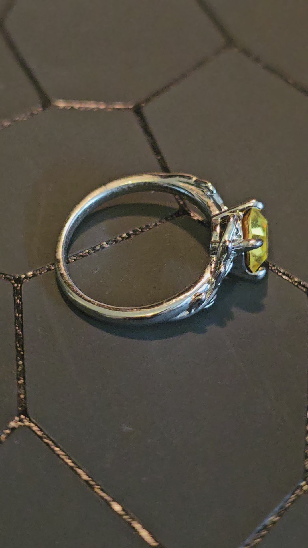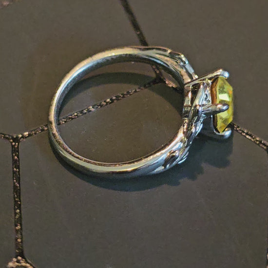 This beautiful new Silver plated solitaire is a leaf and Branch design, and is a size 7. It contains a 7 mm Round cut Cadmium glass stone.