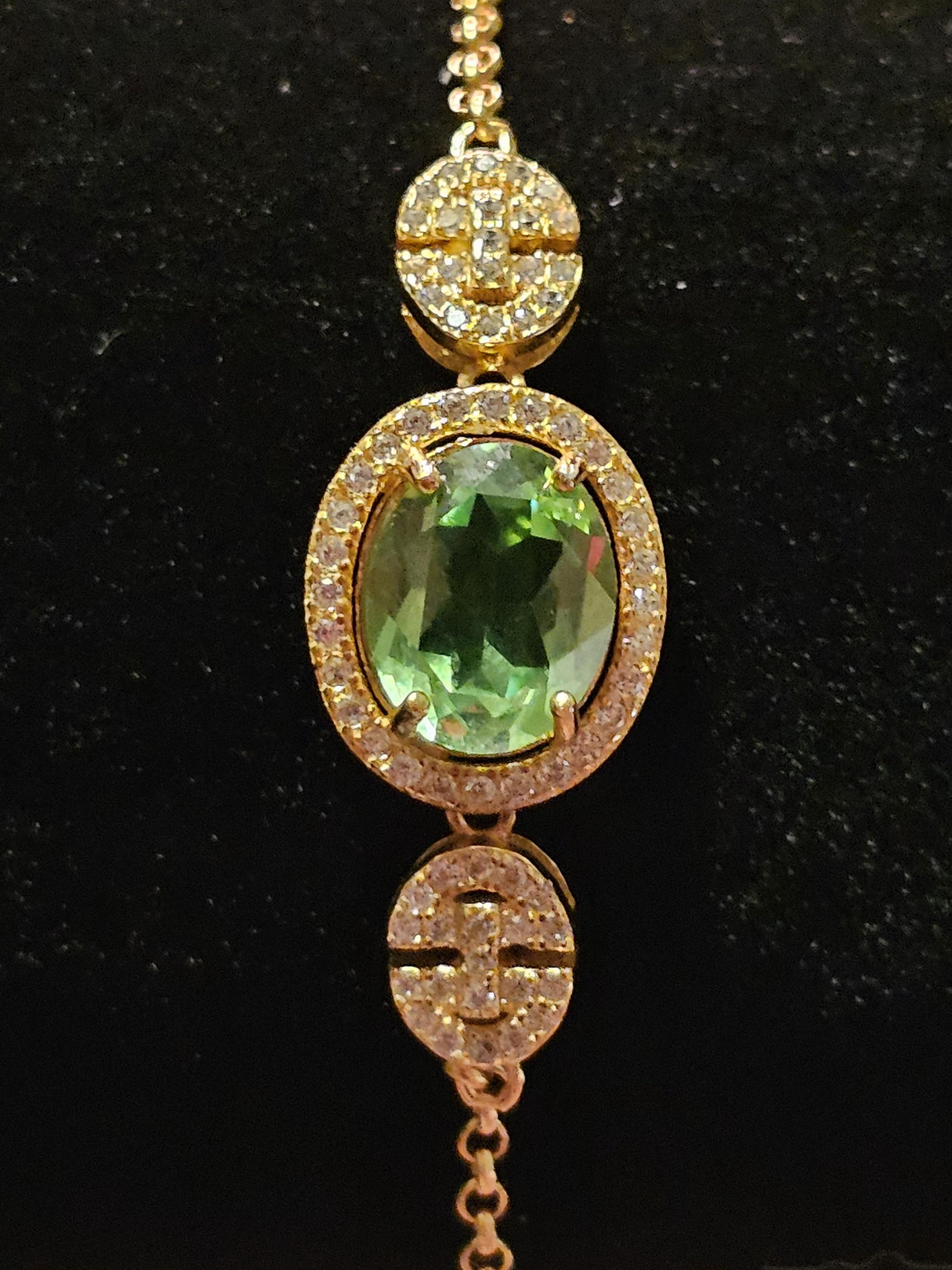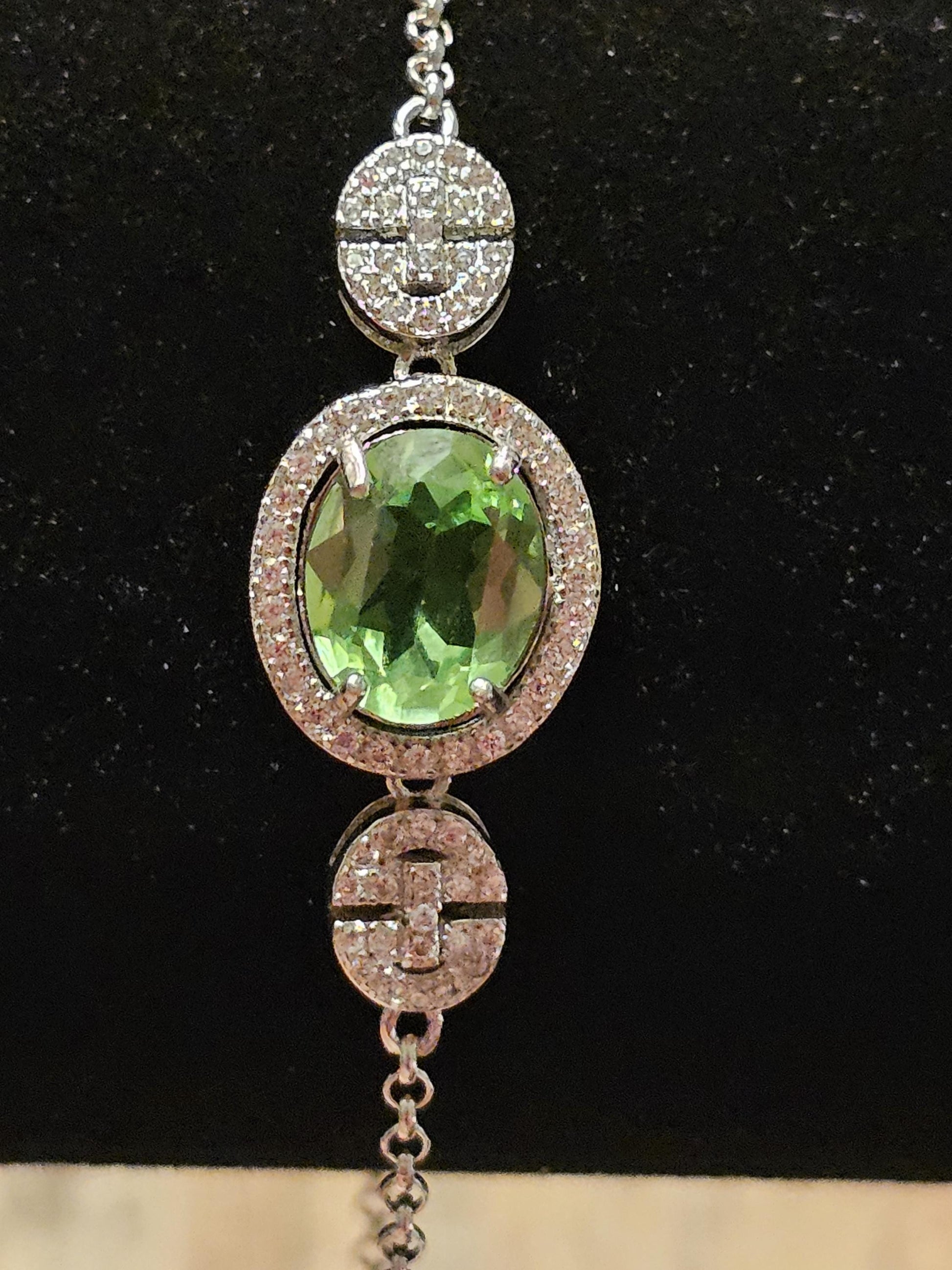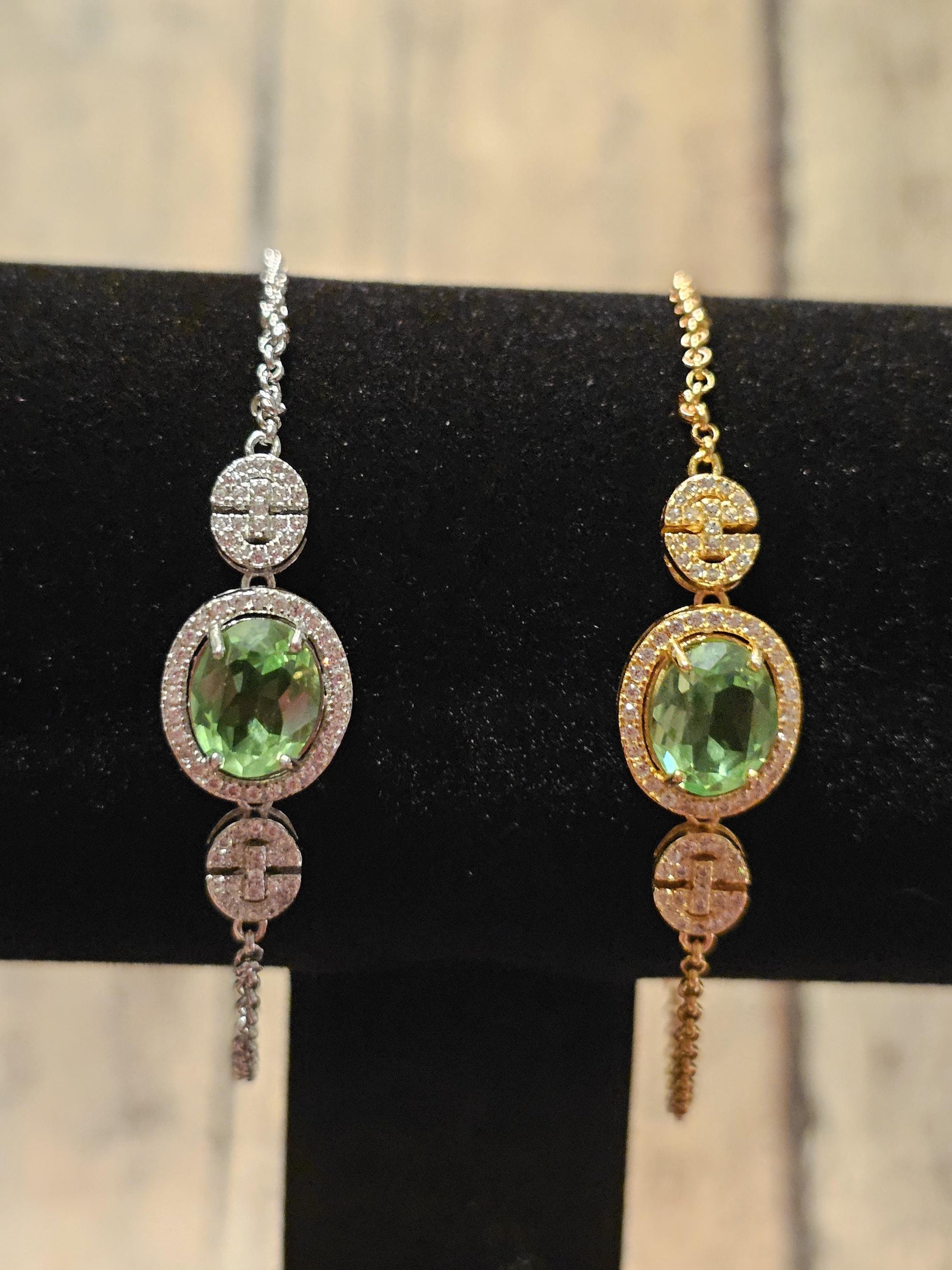 These beautifully styled adjustable new Sterling Silver bracelets are available in white gold or yellow gold plated, and has a vintage Uranium glass stone in a 10x8 mm Oval cut at their center.
