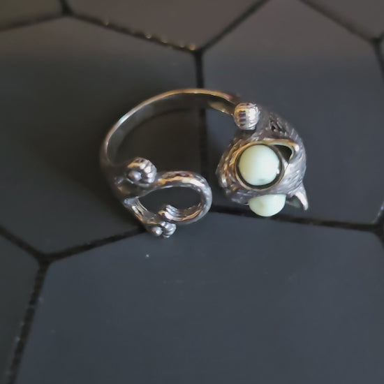 This new Sterling Silver ring is an adorable Cat design and is adjustable. It contains a vintage Uranium glass round cut 4 mm beads in an Opal color as its eyes.