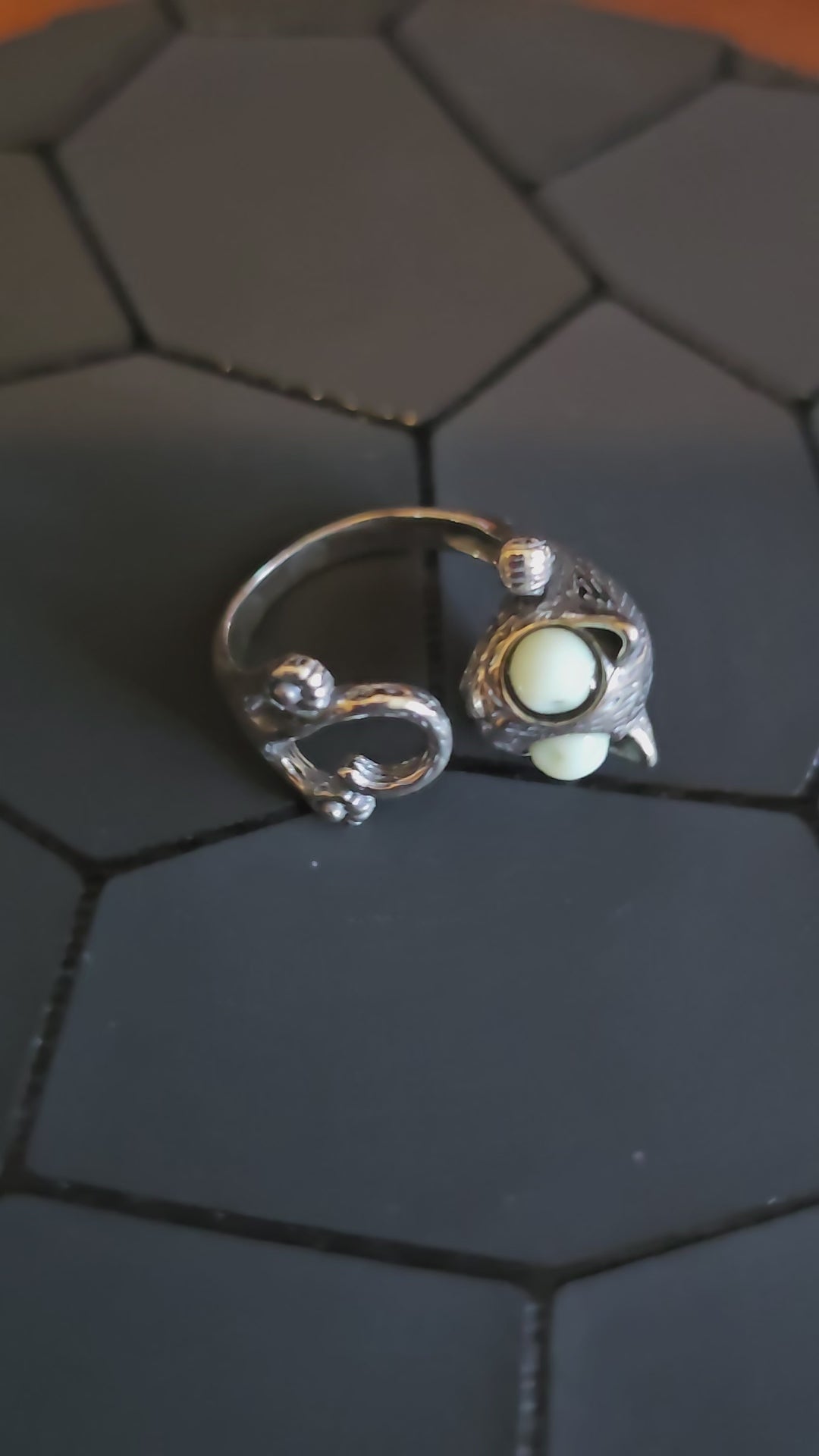 Uranium Glass Cat Ring Adjustable size in new Sterling Silver with vintage Uranium glass beads as eyes that glow under black / UV light