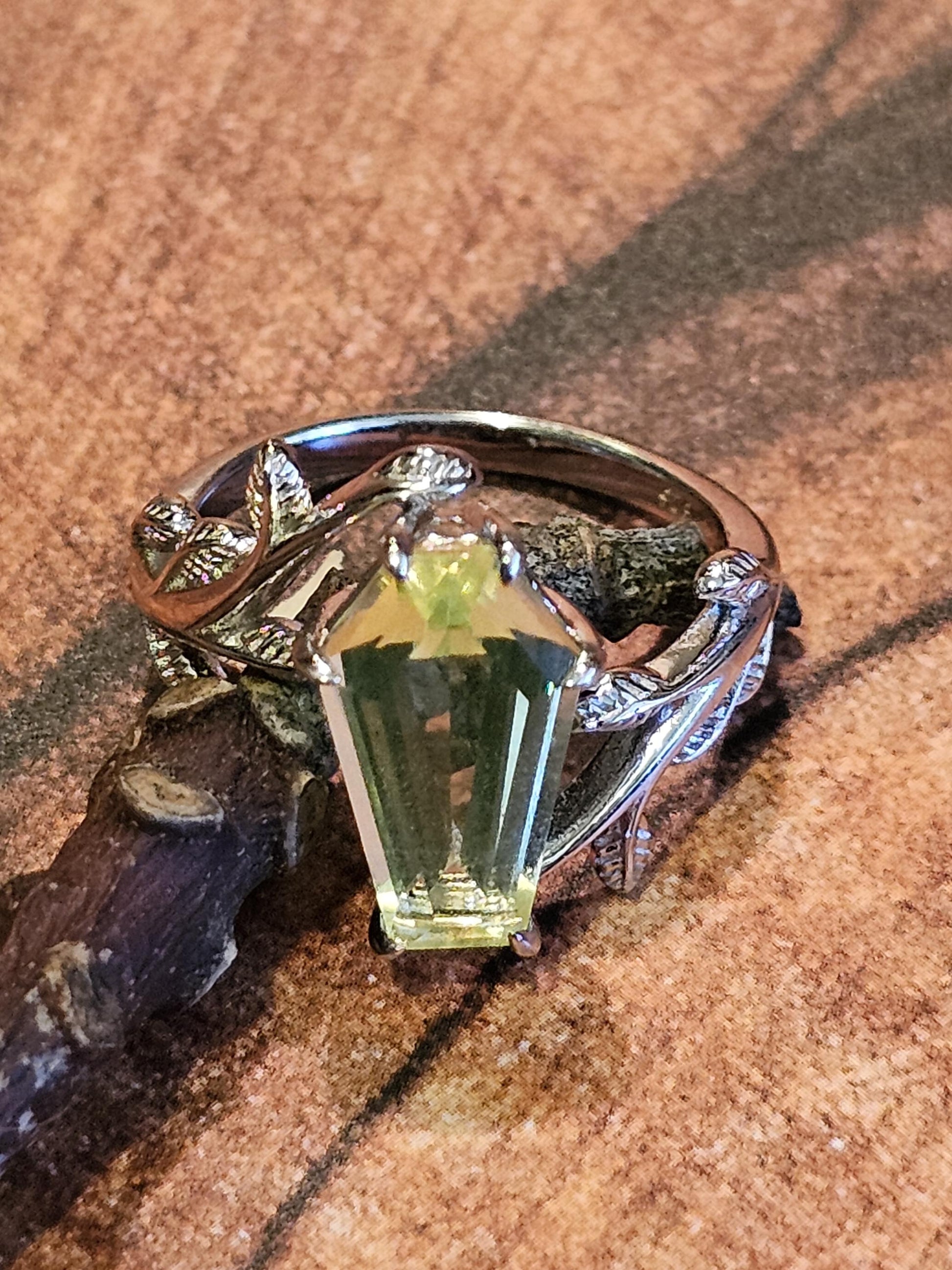 This beautiful, Art Deco style Uranium glass ring has been a journey in its creation. I have never been able to find vintage Uranium glass stones in a Coffin cut, but I've had so many people ask me about them that I decided to explore some other options.