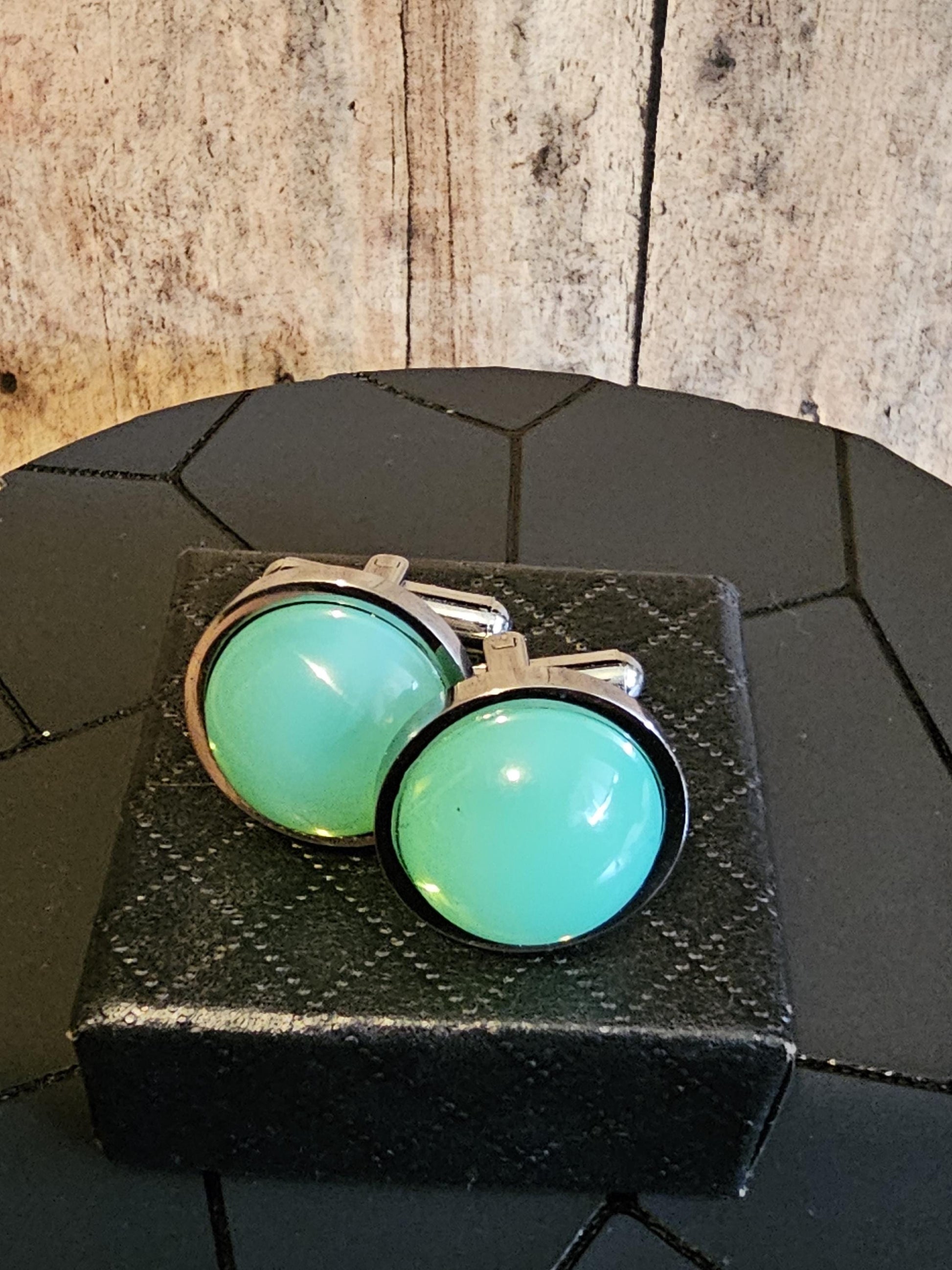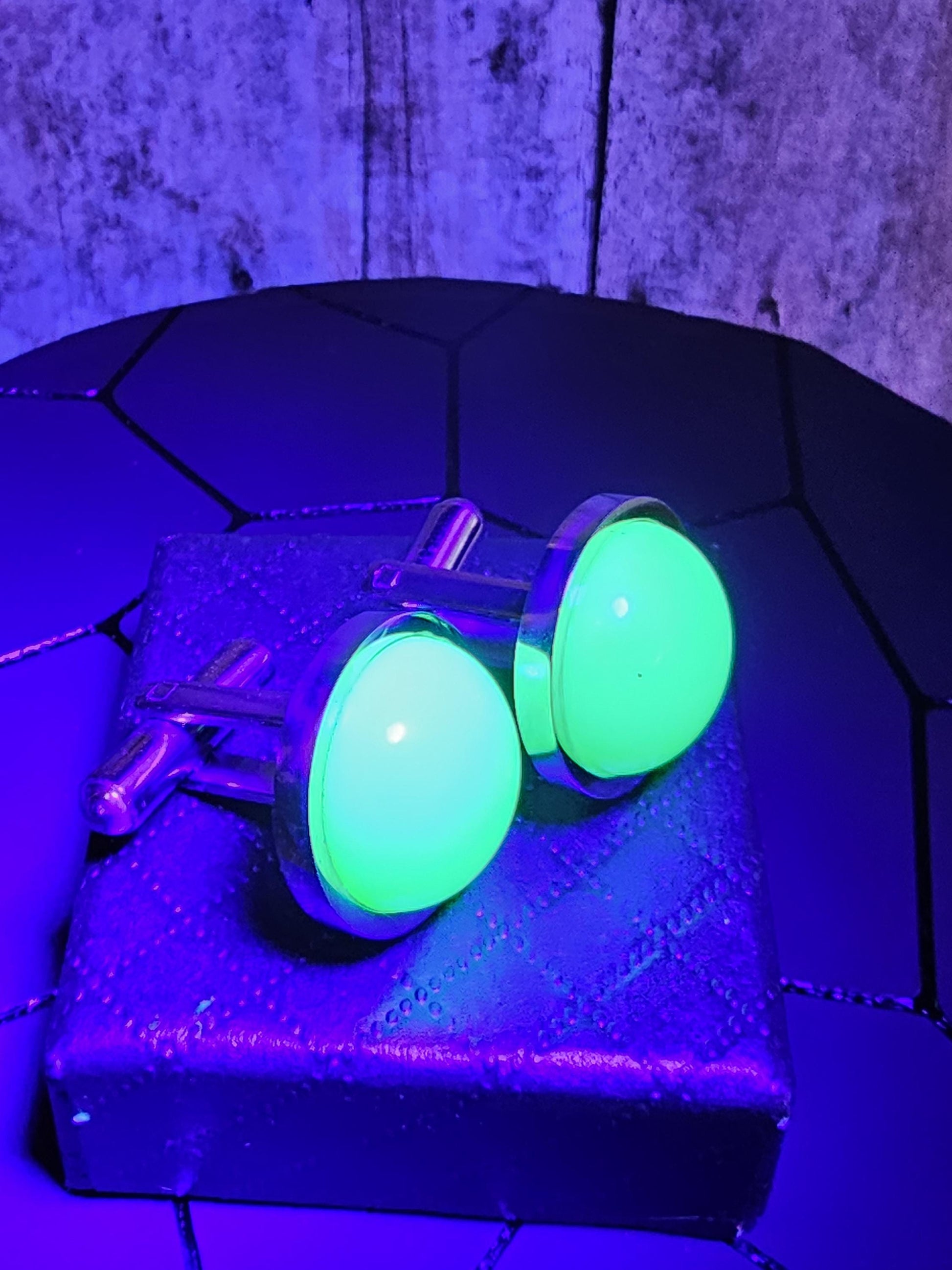 They glow a spectacular Green under black light. I do have Sterling Silver cufflinks available if you would prefer.