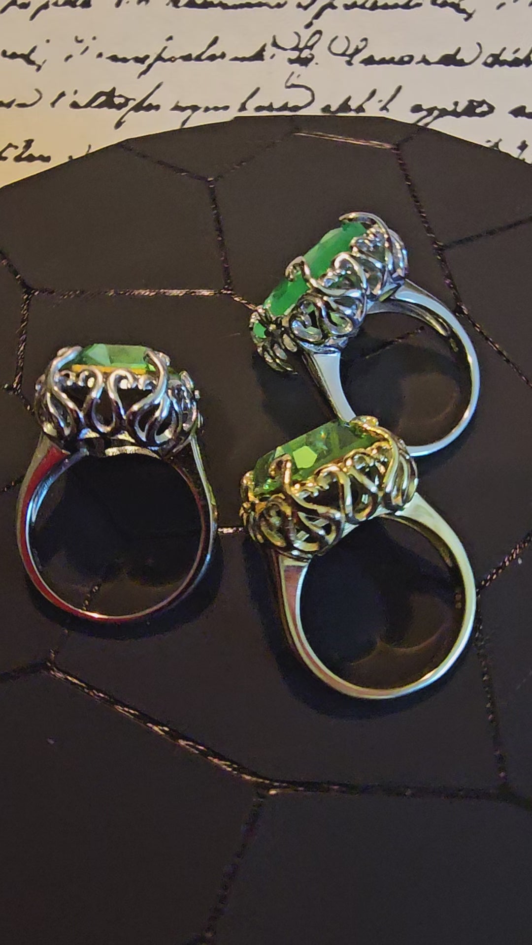 The Peridot colored Stone I found from a supplier in Germany. They were made there in Germany in the early 1970s. They included a postcard when they sent me my stones of their storefront there in Germany so that's what you're seeing in a couple of the pictures. It is mounted in a absolutely beautiful, vintage Art Deco style, new Sterling Silver ring in size 6, 6.5, 7, 7.5, 8, 8.5, or 9.