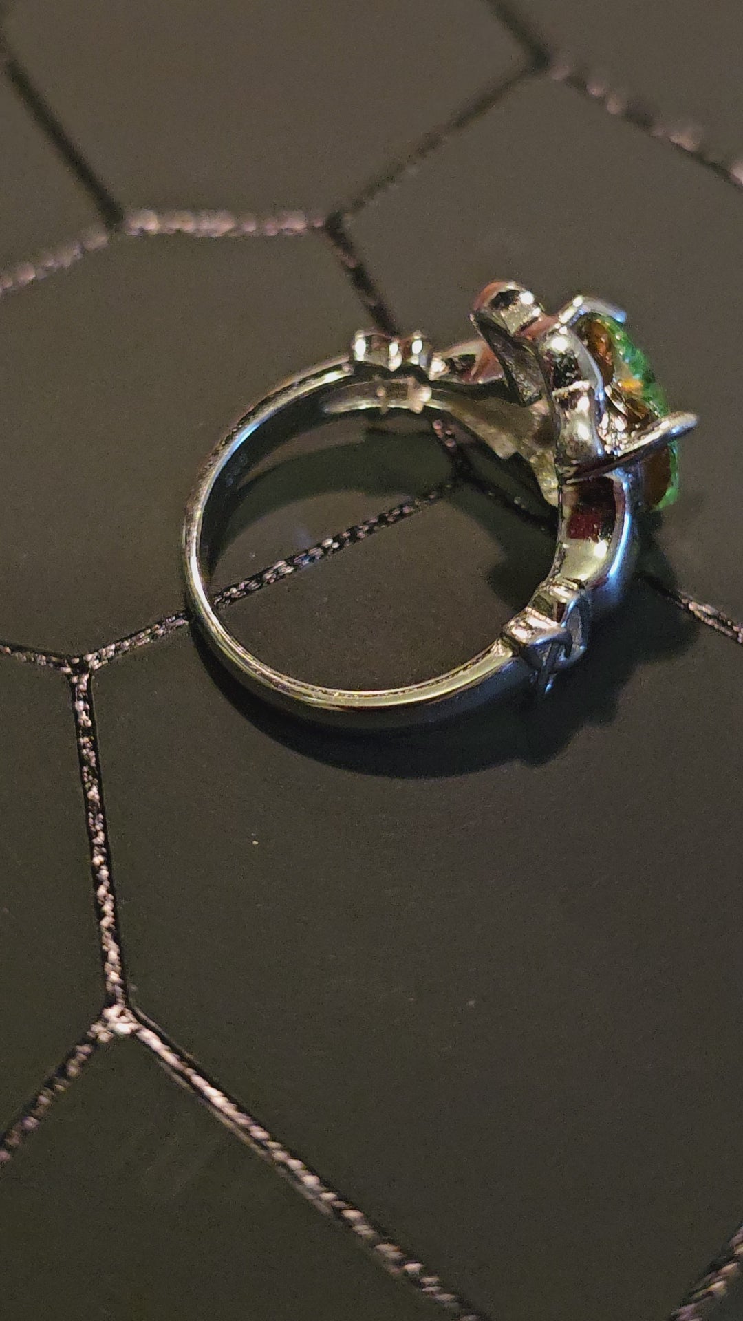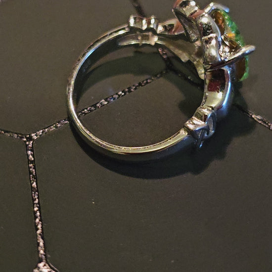 This beautiful large Irish friendship Claddagh ring is new Sterling Silver and is currently available in a size 7. It contains a large vintage Uranium glass 10 mm heart cut stone.