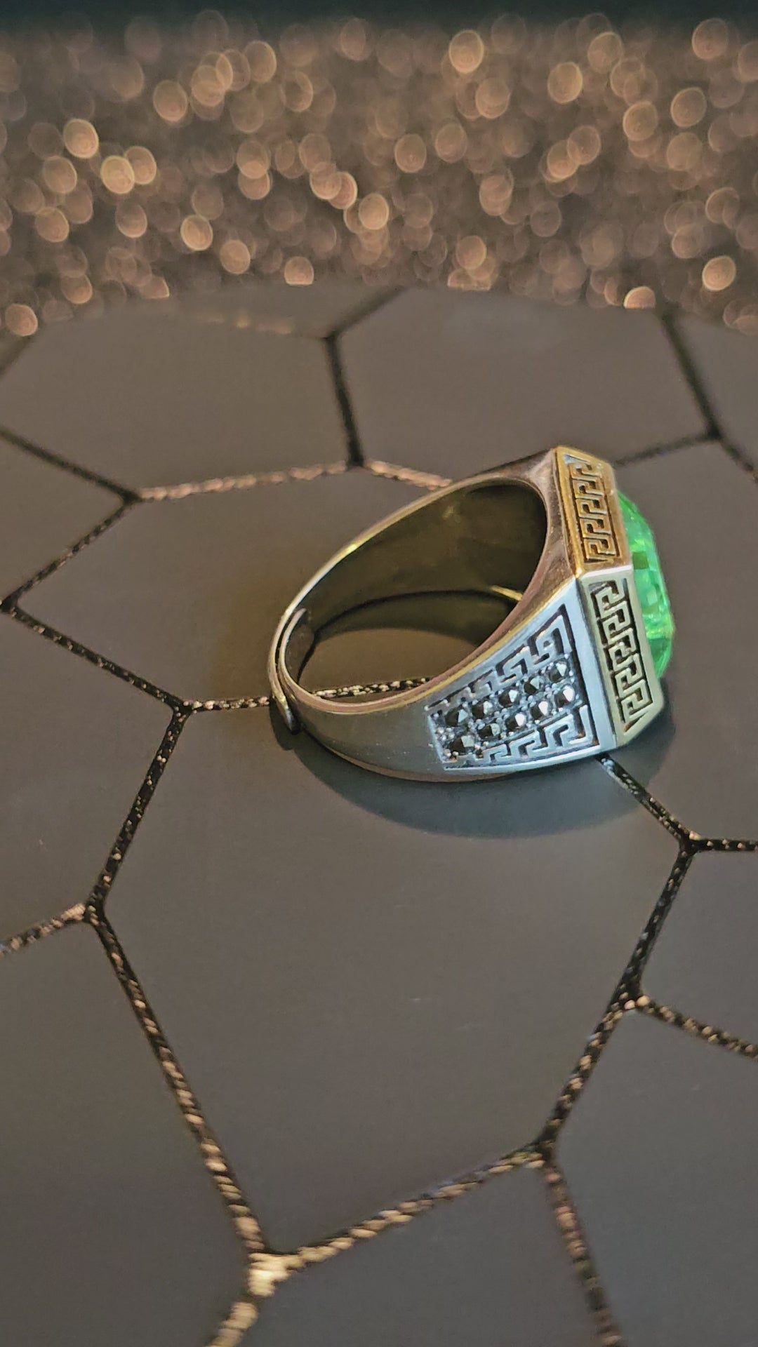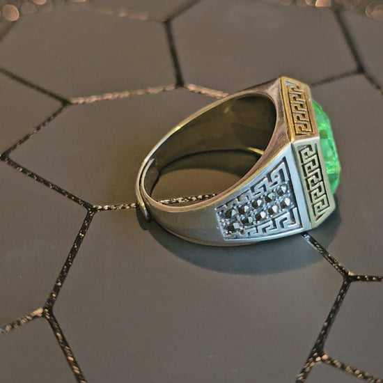 This new Men's Sterling Silver solitaire ring is adjustable and contains a gorgeous Square cut vintage Uranium glass stone in 10x10 mm.