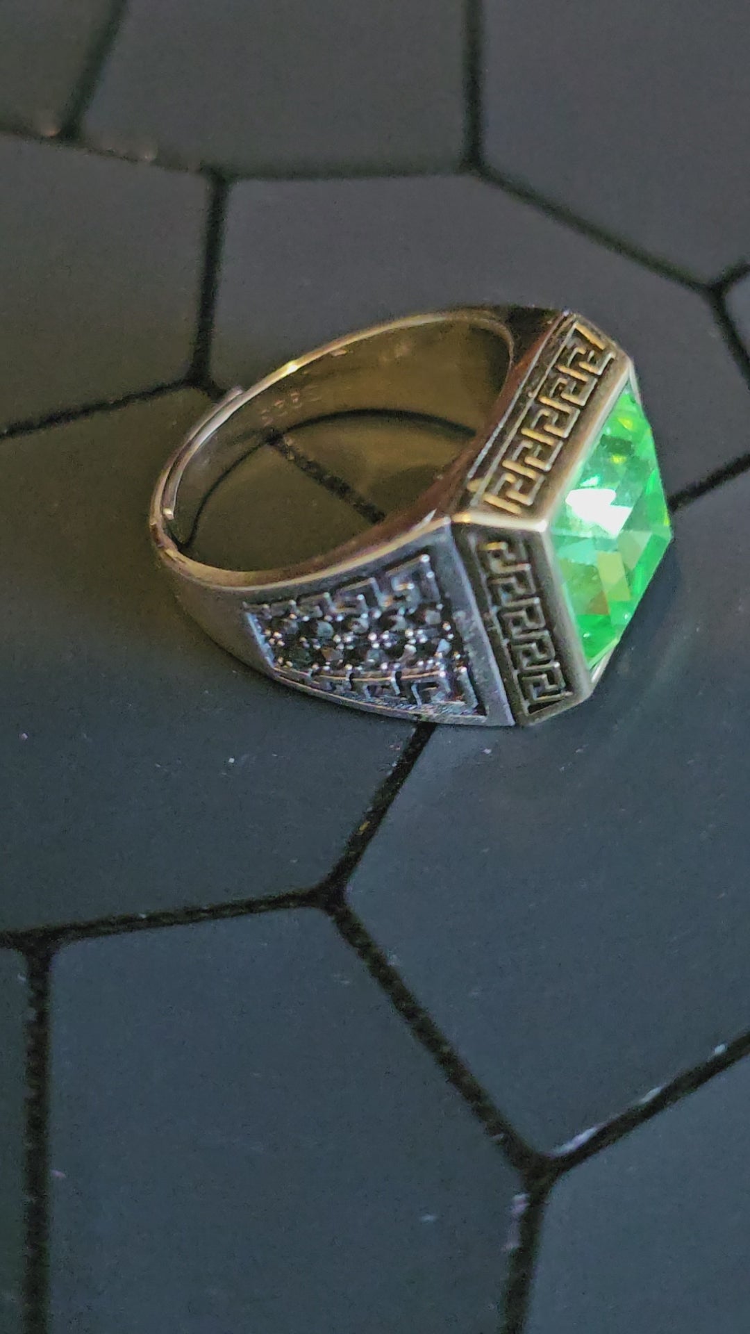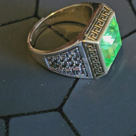 This new Men's Sterling Silver solitaire ring is adjustable and contains a gorgeous Square cut vintage Uranium glass stone in 10x10 mm.
