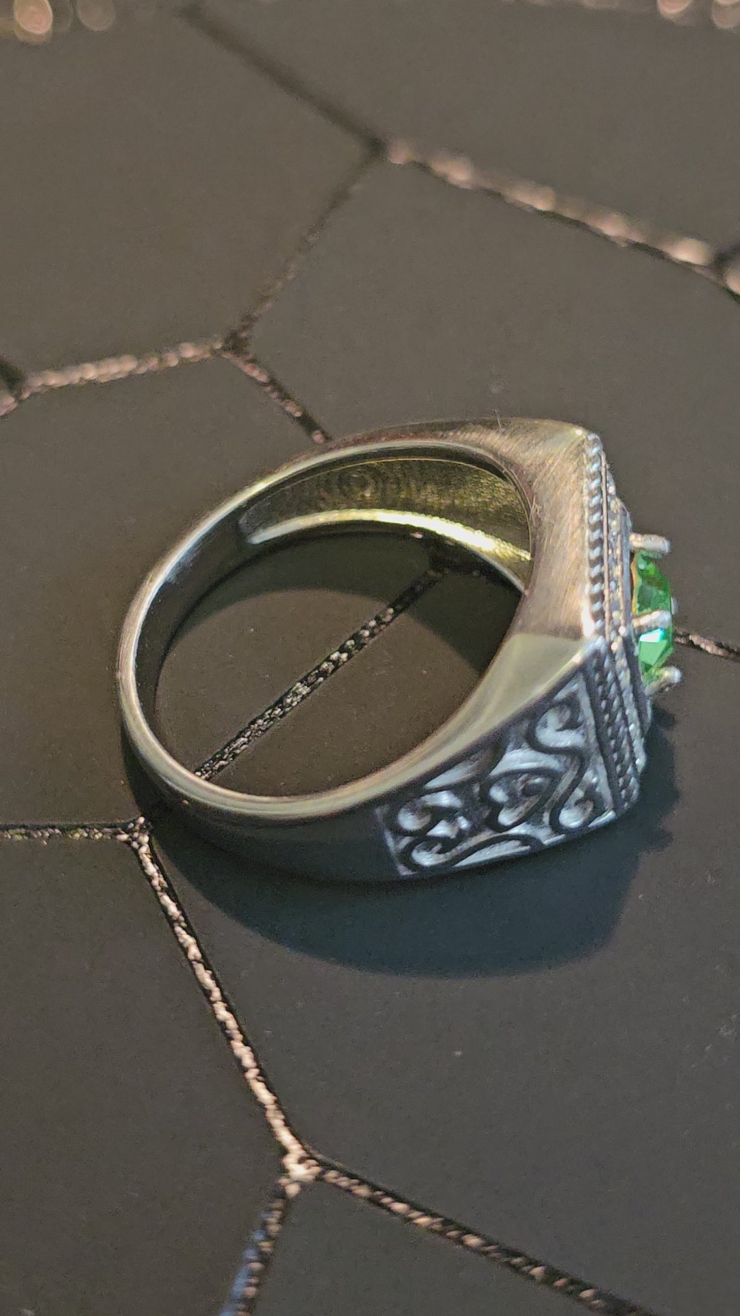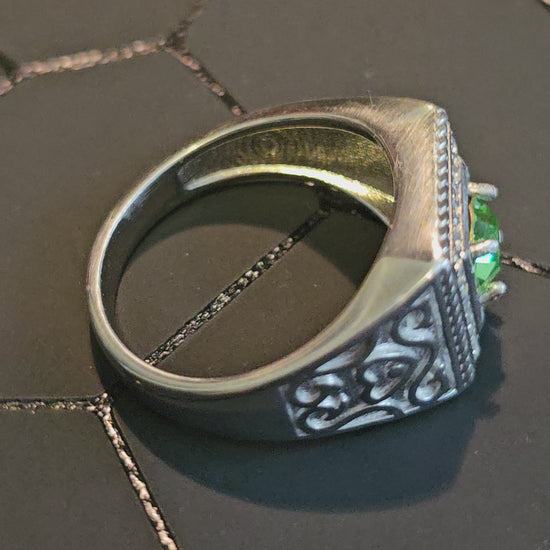 This stylish and substantial new sterling silver Men's ring is available in size 10.5. It contains a vintage Round cut Uranium glass stone in 6 mm.