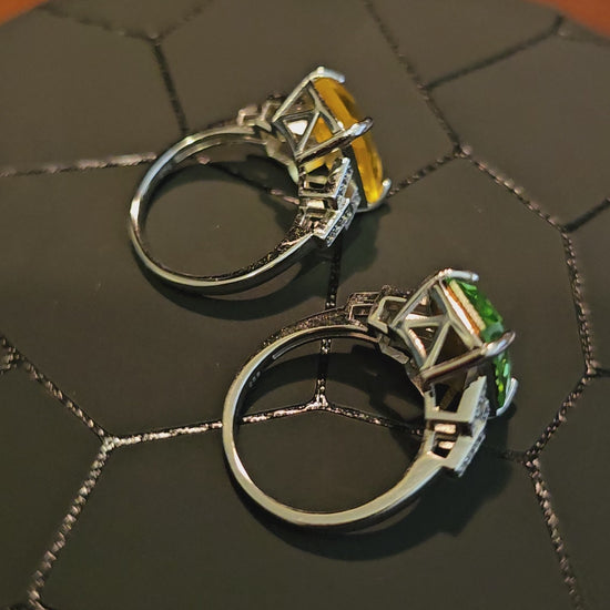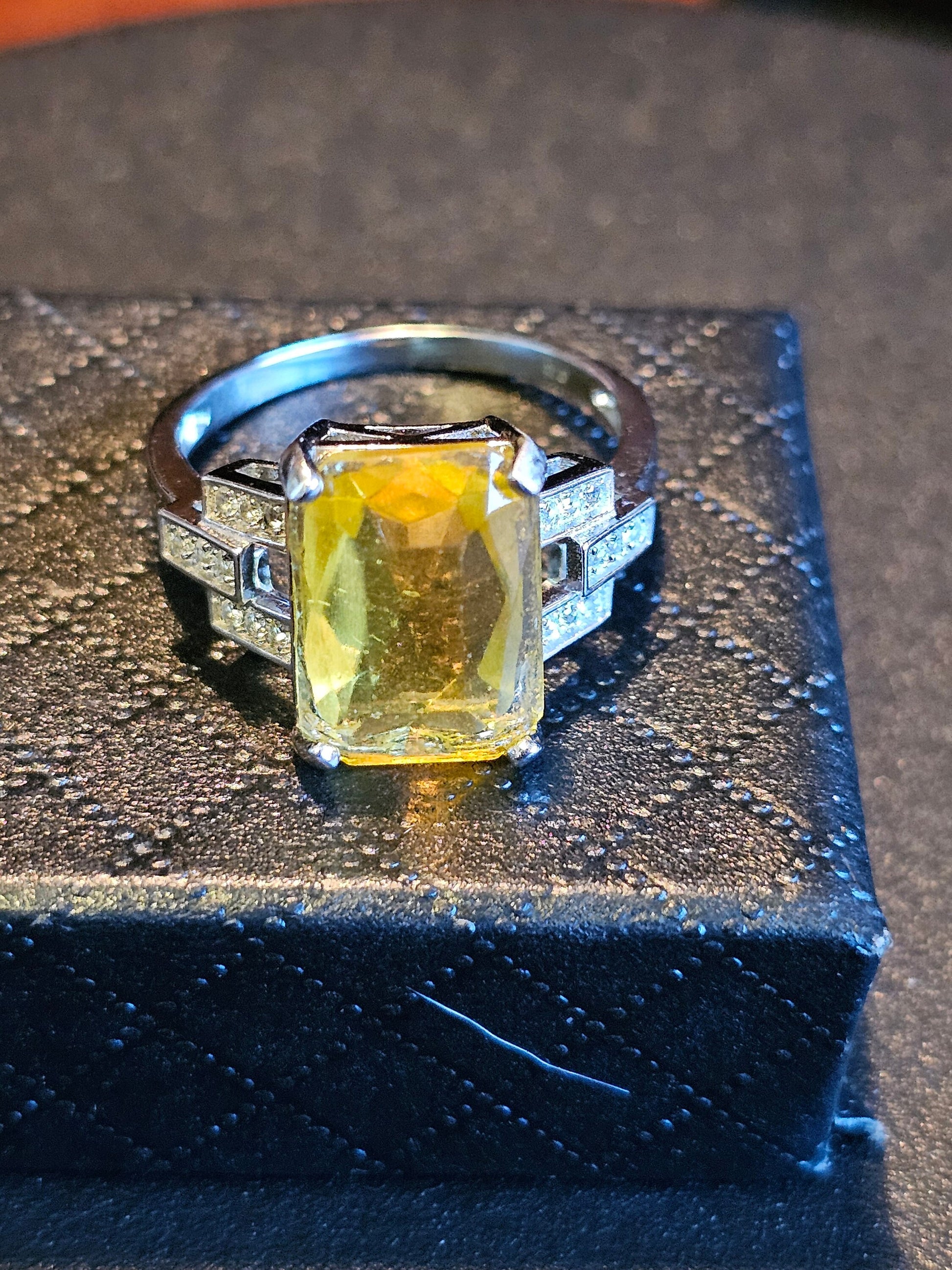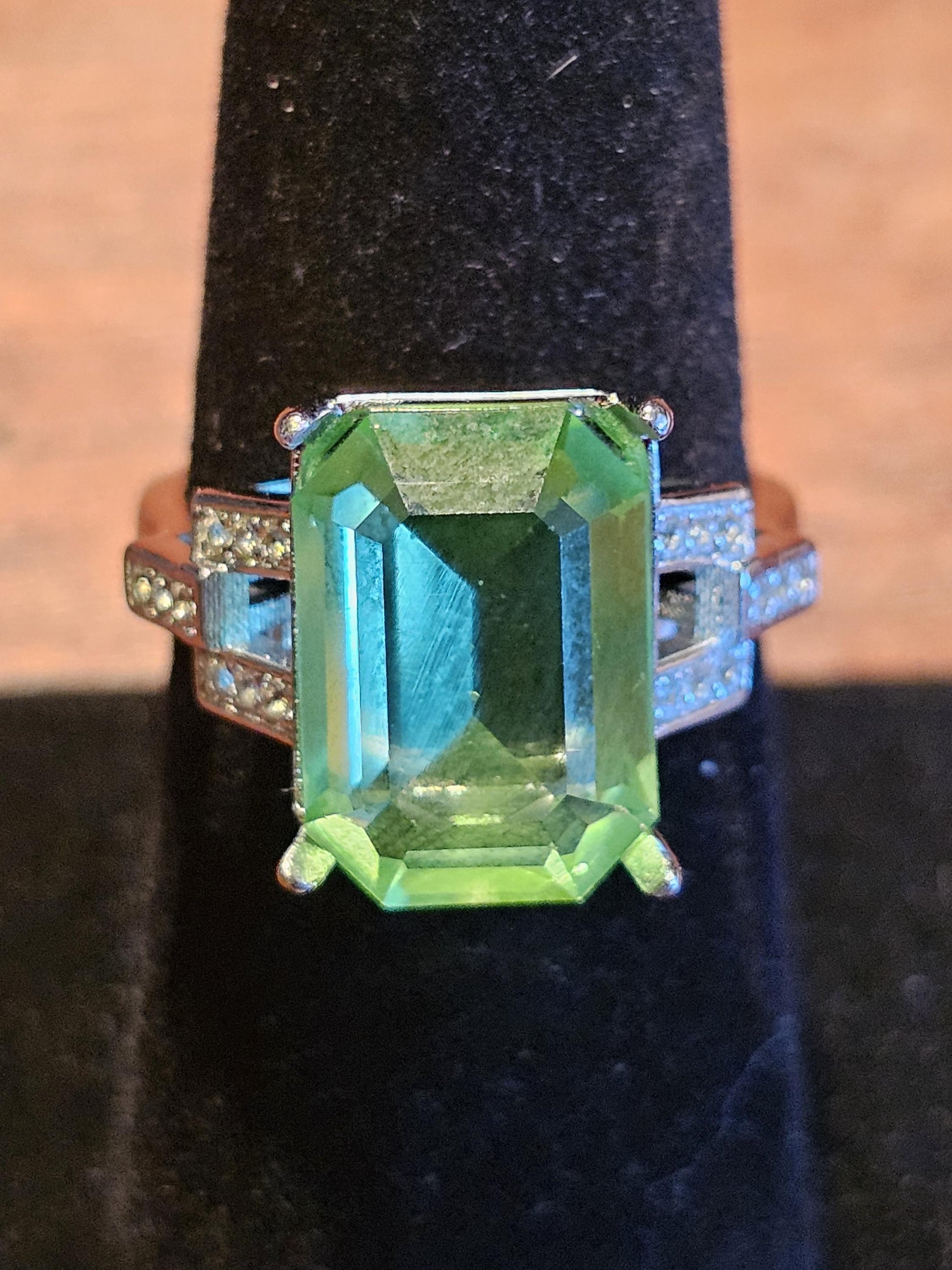 This beautiful new Sterling Silver ring is currently available in a size 7. It contains a vintage Yellow or Green Uranium glass Stone in a large 14x10 mm Emerald cut.