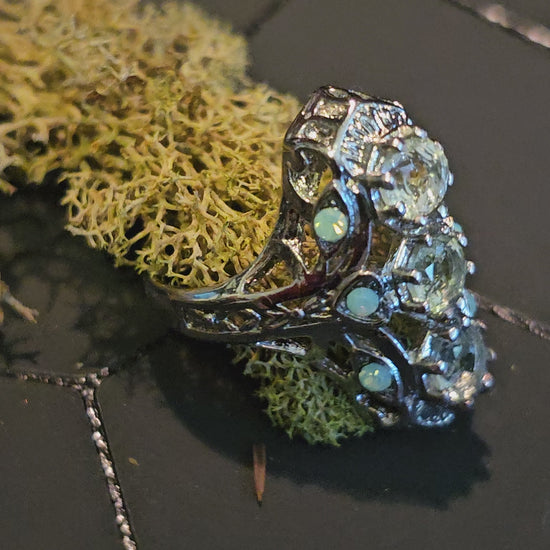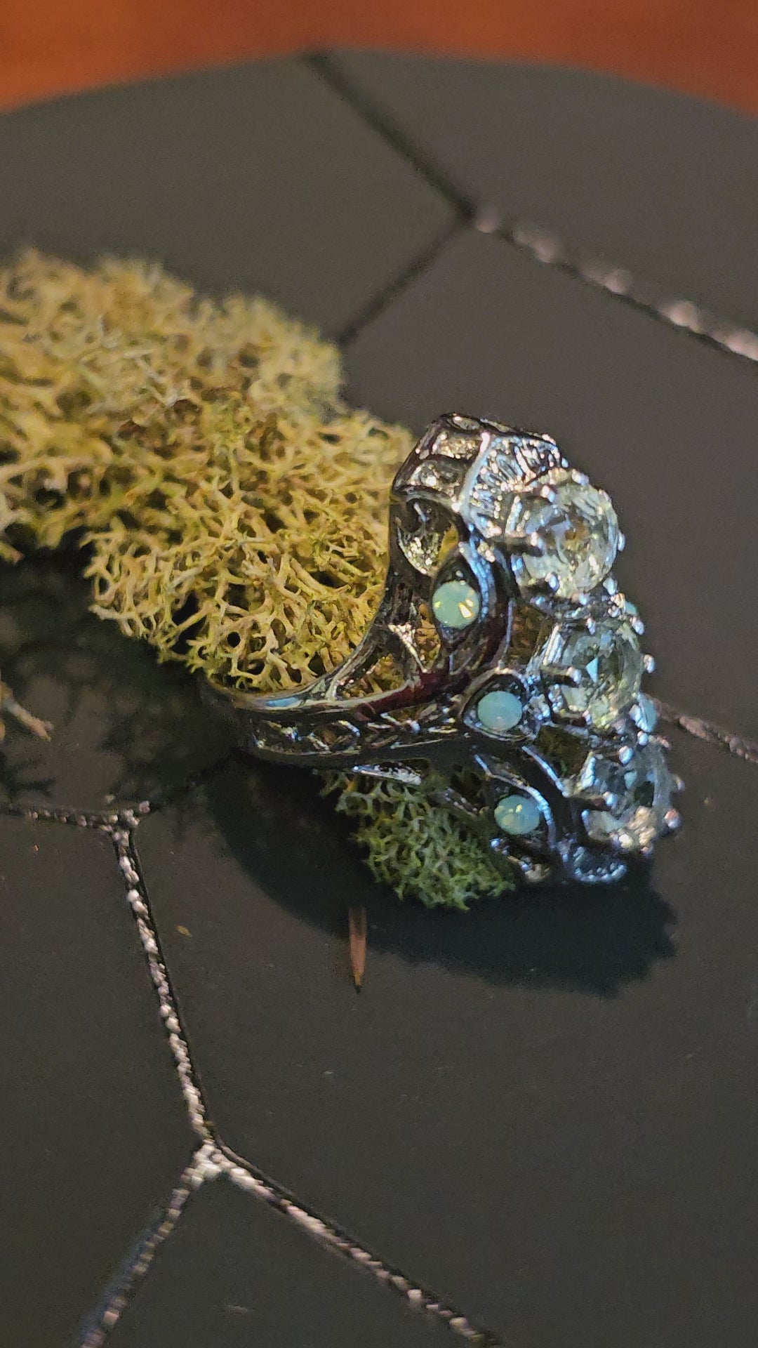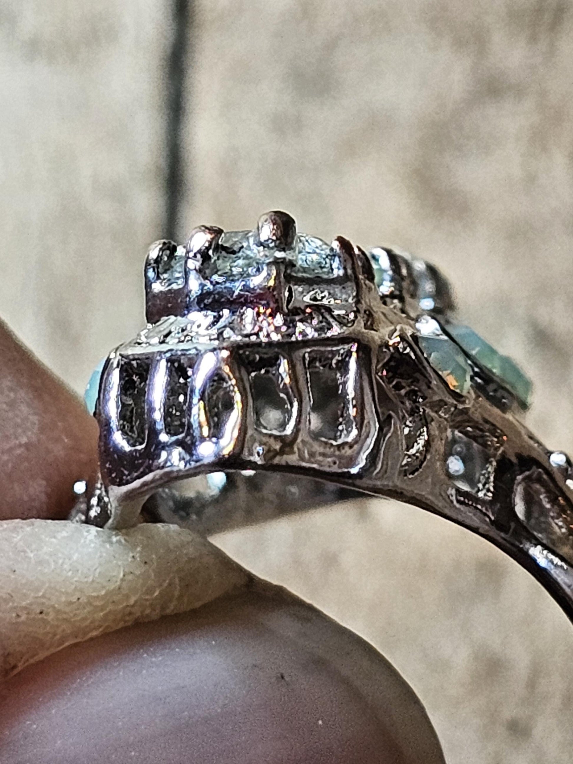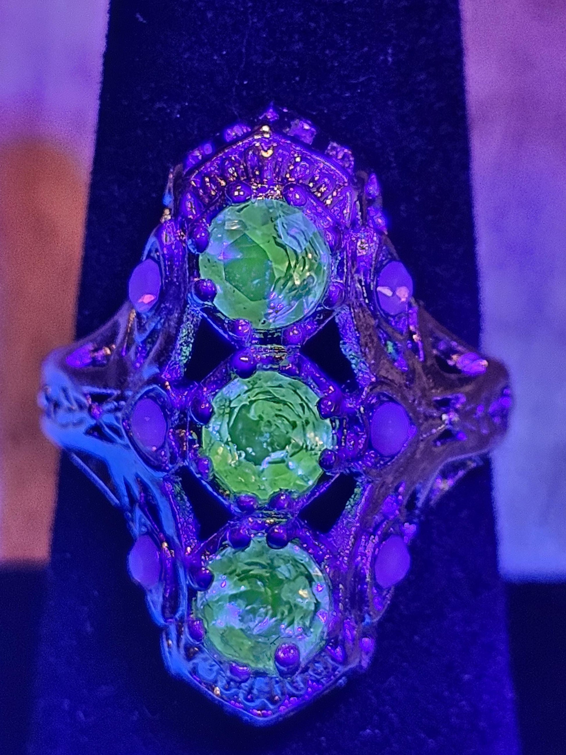 This new Sterling Silver ring is in a size 7. The 5 mm Round cut stones were cut and salvaged by a jeweler from a broken pre 1975 Uranium glass dish.