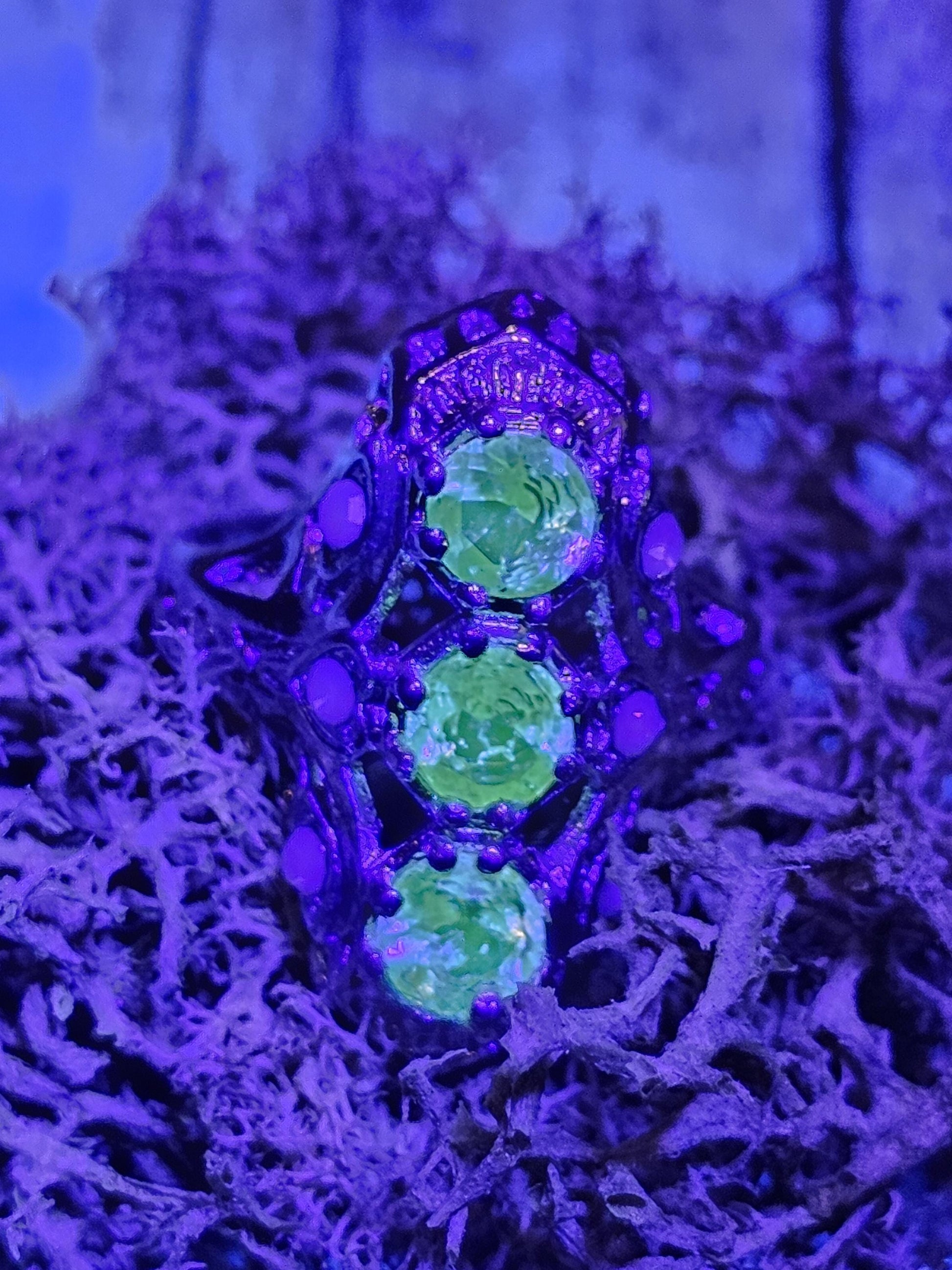 Uranium Glass Round cut Ring Shield style new Sterling Silver with three 5 mm vintage Uranium glass stones that glow under black / UV light